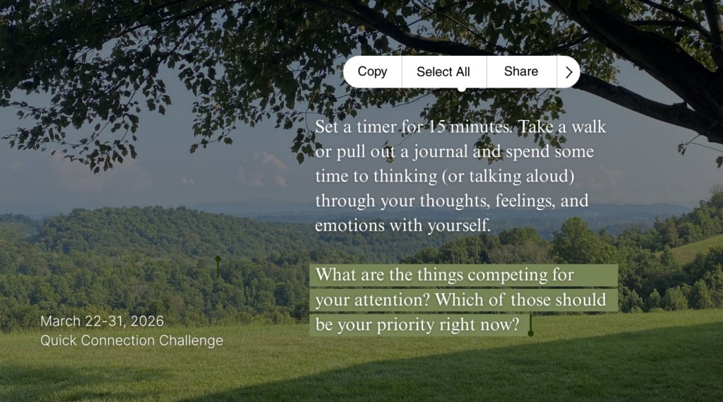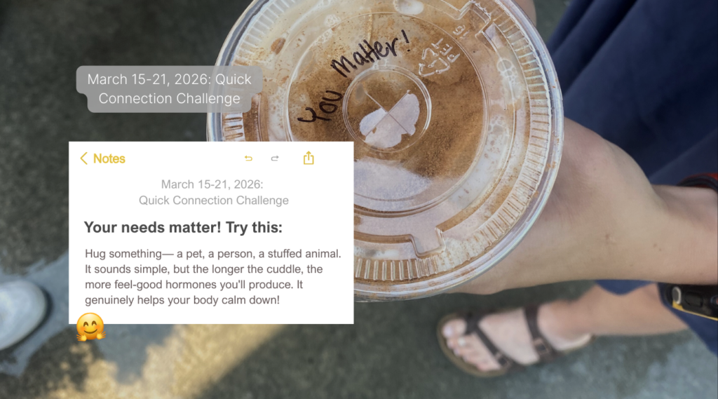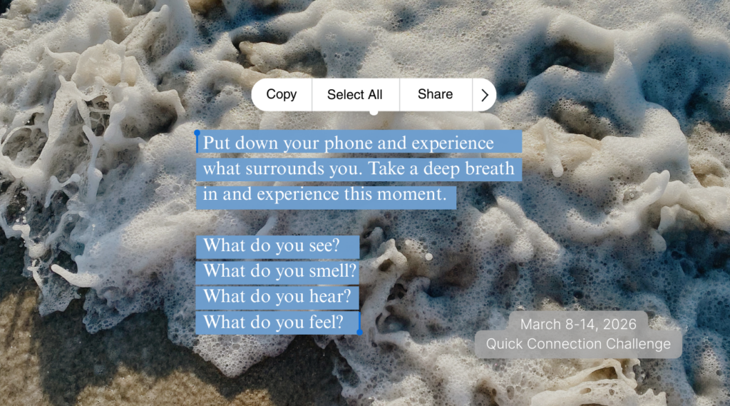We’re back with another month of connection challenges! This month’s theme is #amomentformemarch because as Dr. Vivek Murthy says: “It turns out that our ability to connect with other people is driven by our ability to connect deeply with ourselves.”
